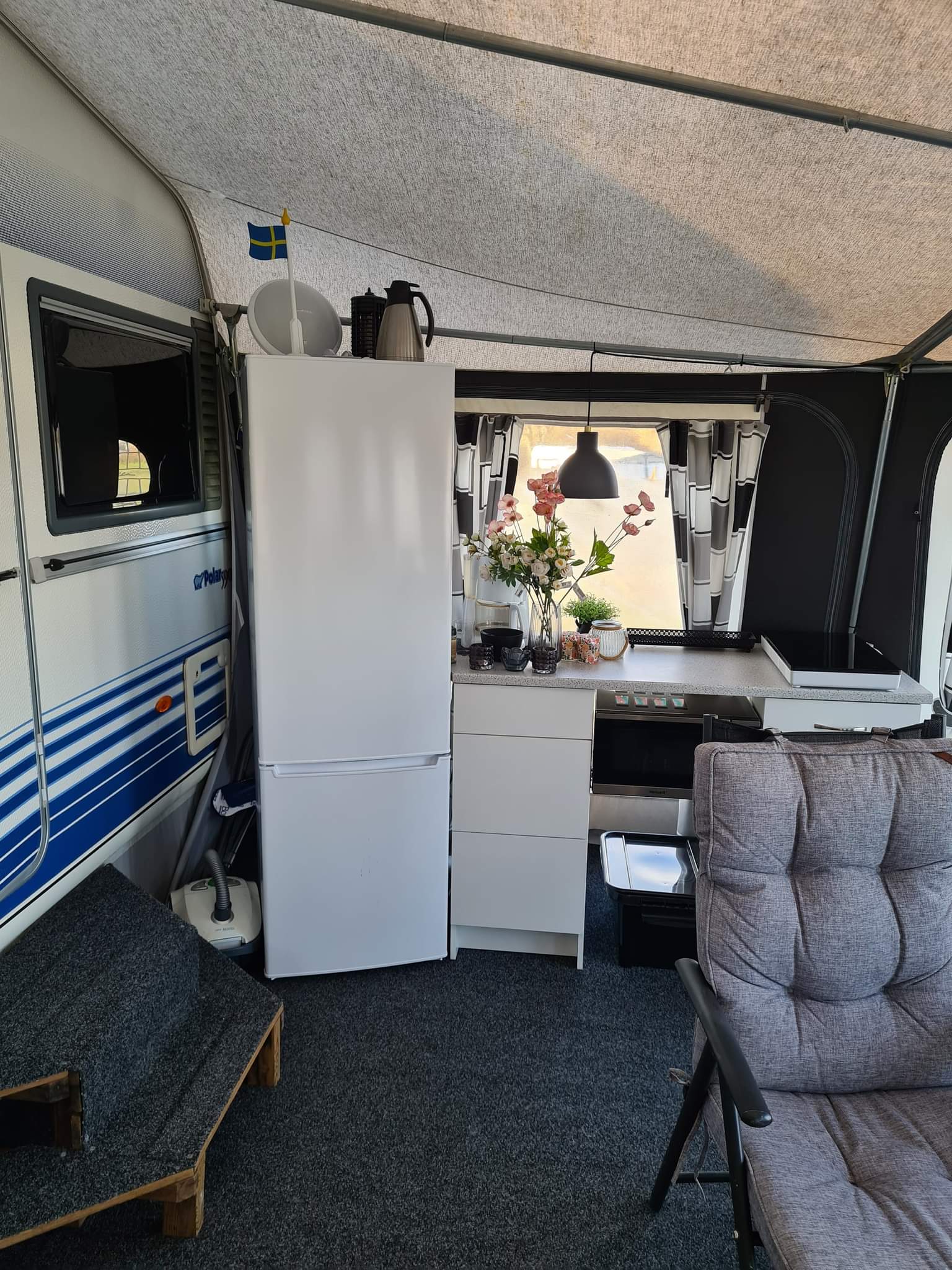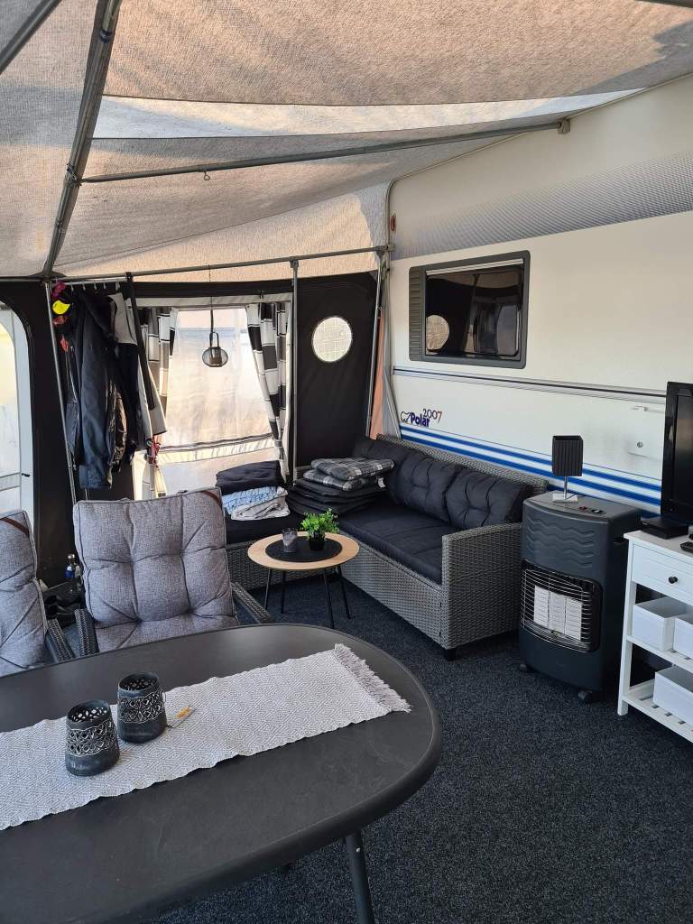 I morse vaknade vi upp till sol och vindstilla väder. Kyligt men riktigt gott när solen värmer. Frukosten åt vi inne i husvagnen men kaffet drack vi senare ute i förtältet. Vi är så nöjda med hur vi i år har det i vårt förtält. Titta in nedanför och se hur fint vi fått det.