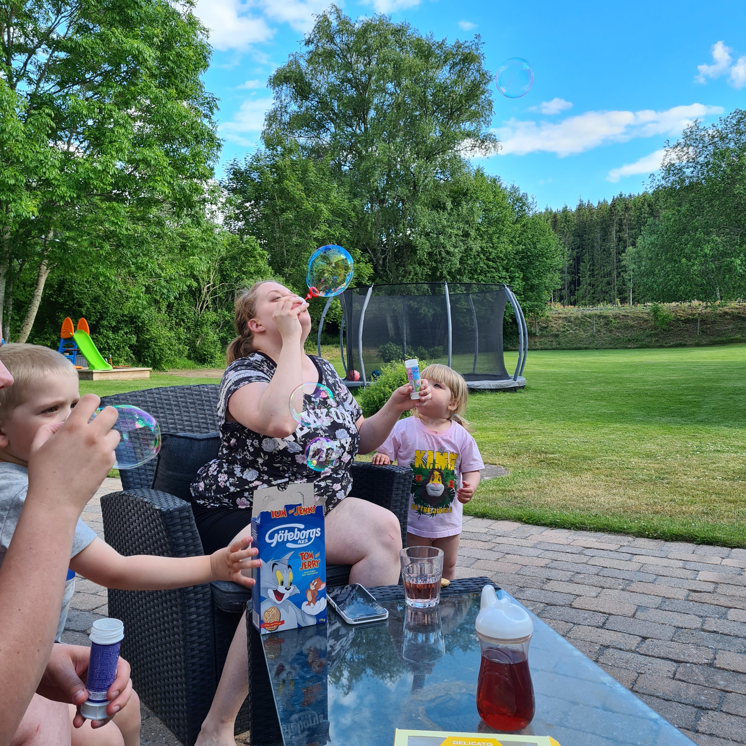 De fick varsina såpbubblor och bubblorna försvann fort med vinden. Arvid jagade dem och smällde dem 😉.