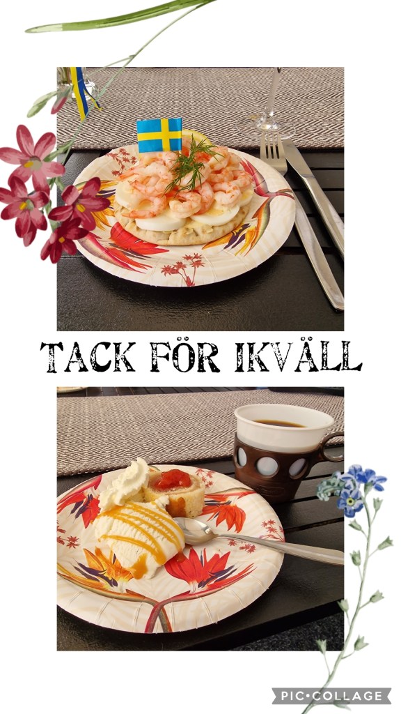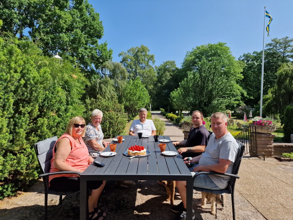 När allt var på sin plats så var det dags att gå ner mot stranden till våra vänner Åke och Viveca. Där blev vi bjudna på jättegod räksmörgås och kaffe och efterrätt.