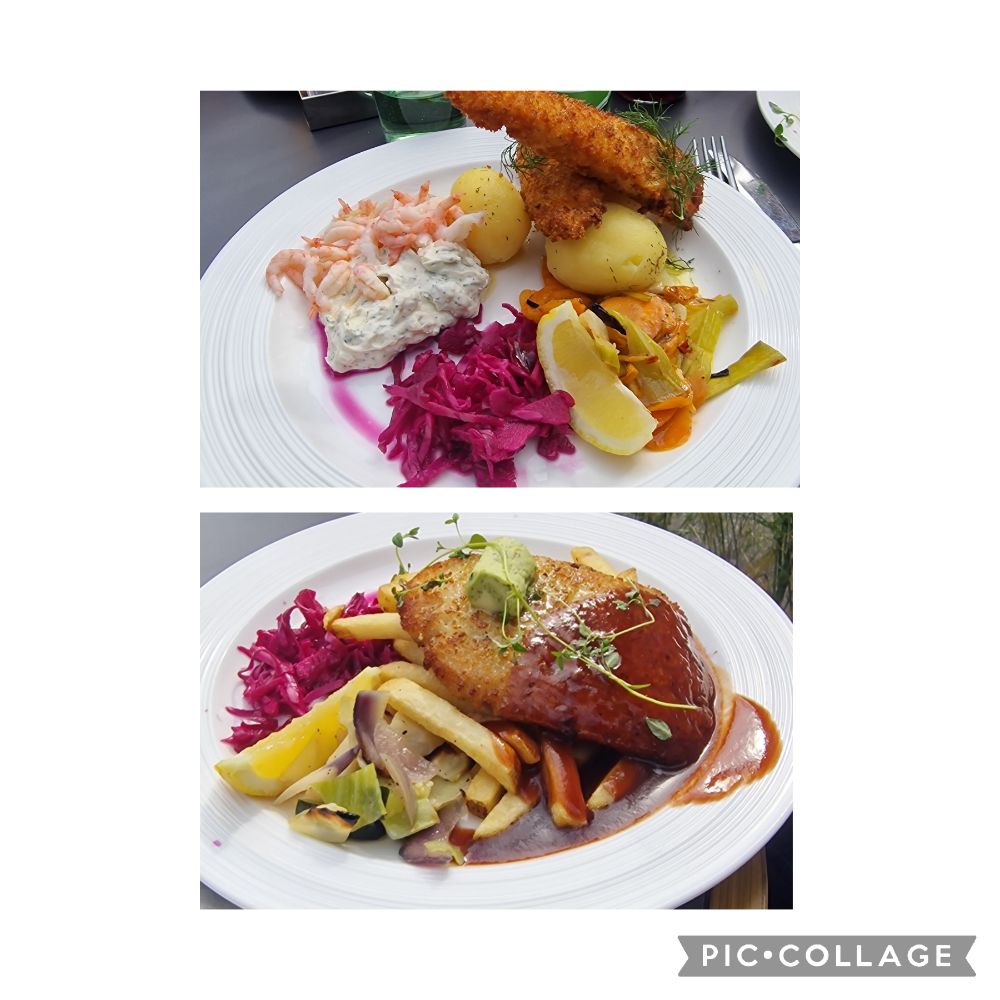 Idag var vi på Café Sött & Salt i Kristianopel. Vi åt snitzel med pommes och panerad torsk, kokt potatis med räkor och picklade grönsaker. En varsin glass till efterrätt.