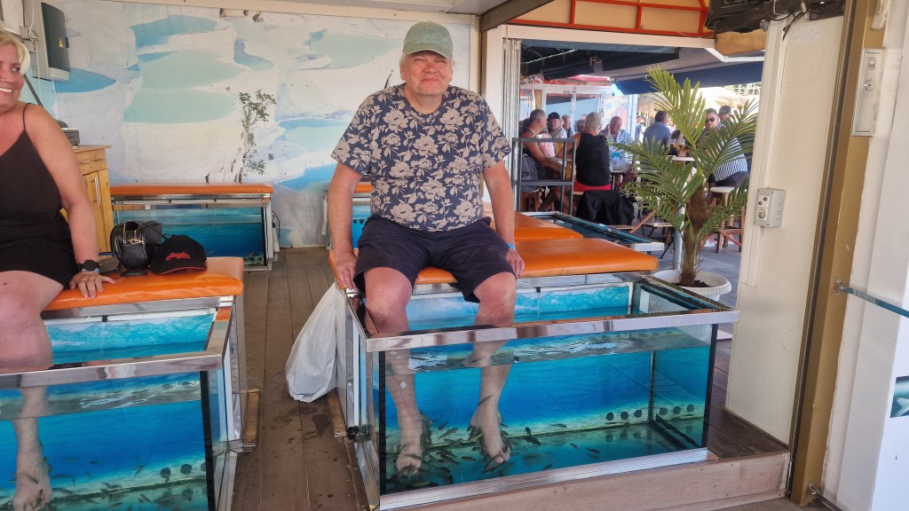 Sen gjorde vi något som vi pratat om länge men inte vågat göra….fiskpedikyr (fisk-SPA). Det kittlade gott, jag som är så kittlig under fötterna fick bita ihop 🫣. Men vi gjorde det, båda två…