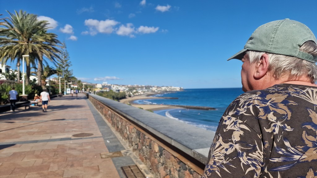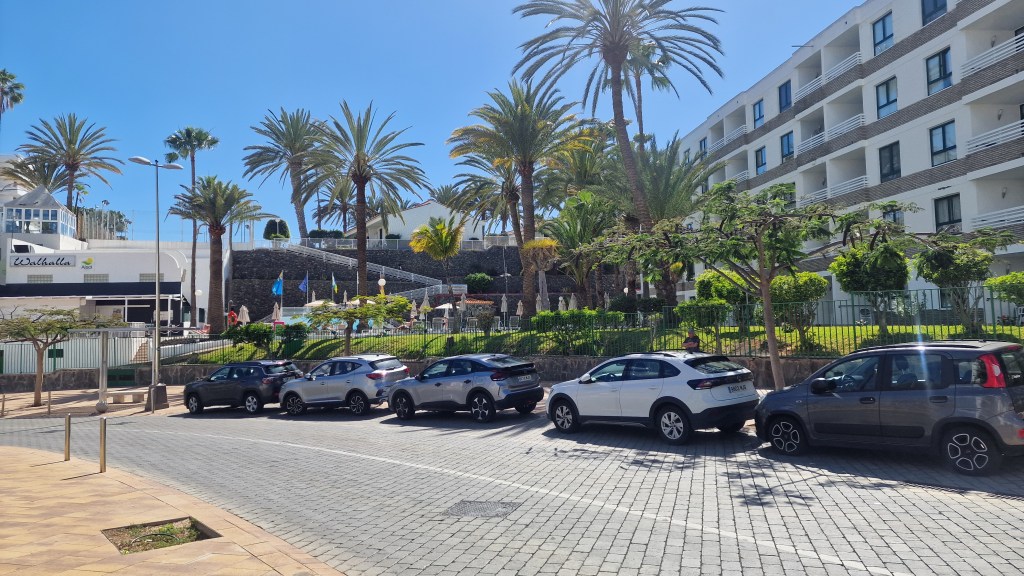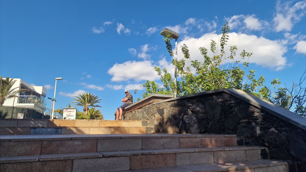 Efter insmörning med solskyddsfaktor 50+ så gick vi ner till poolområdet och tog varsin solstol. Med kepsar på började vi att sola, men det tog inte LP g stund innan Jörgen inte klarade mer. Han tog på tröja och parasollet fick ge honom skydd….tills det började blåsa och poolkillen tog ner alla parasoller. Då gick Jörgen upp på rummet och jag solade vidare en stund till.