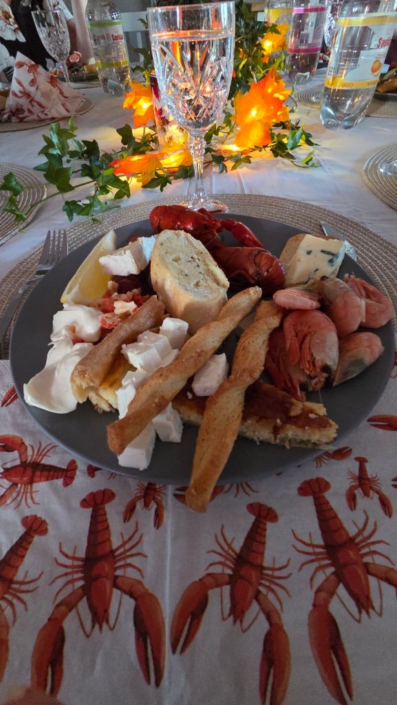 I lördags på Trummenäs Camping hade jag och min man kräftfest tillsammans med tre andra par. Jag älskar skaldjur så jag åt med glädje och god aptit. Till mannen hade jag gjort kycklingsallad, ost och kex fanns också. Var och en tog med sig mat och dryck, det var så mycket mat så hälften hade räckt. Trevligt hade vi iallafall och proppmätta blev vi allihopa!