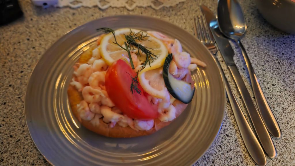 Fredagskvällen, en skön och mysig kväll i husvagnen. Konditori Oscar fick servera varsin räksmörgås till maken och mig och de är som alltid – jättegoda!