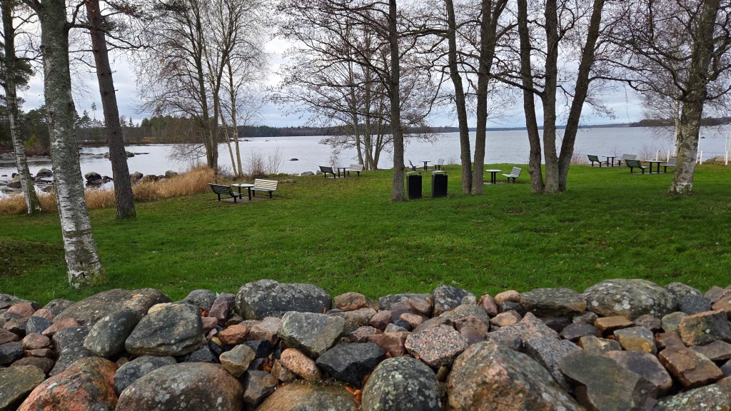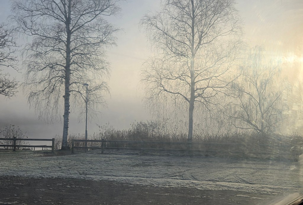 -6° och sjön ligger insvept i dimma, där solen försöker ta sig igenom. Känns att det blir en vacker dag, även idag. Frukost nu med kaffe därtill.