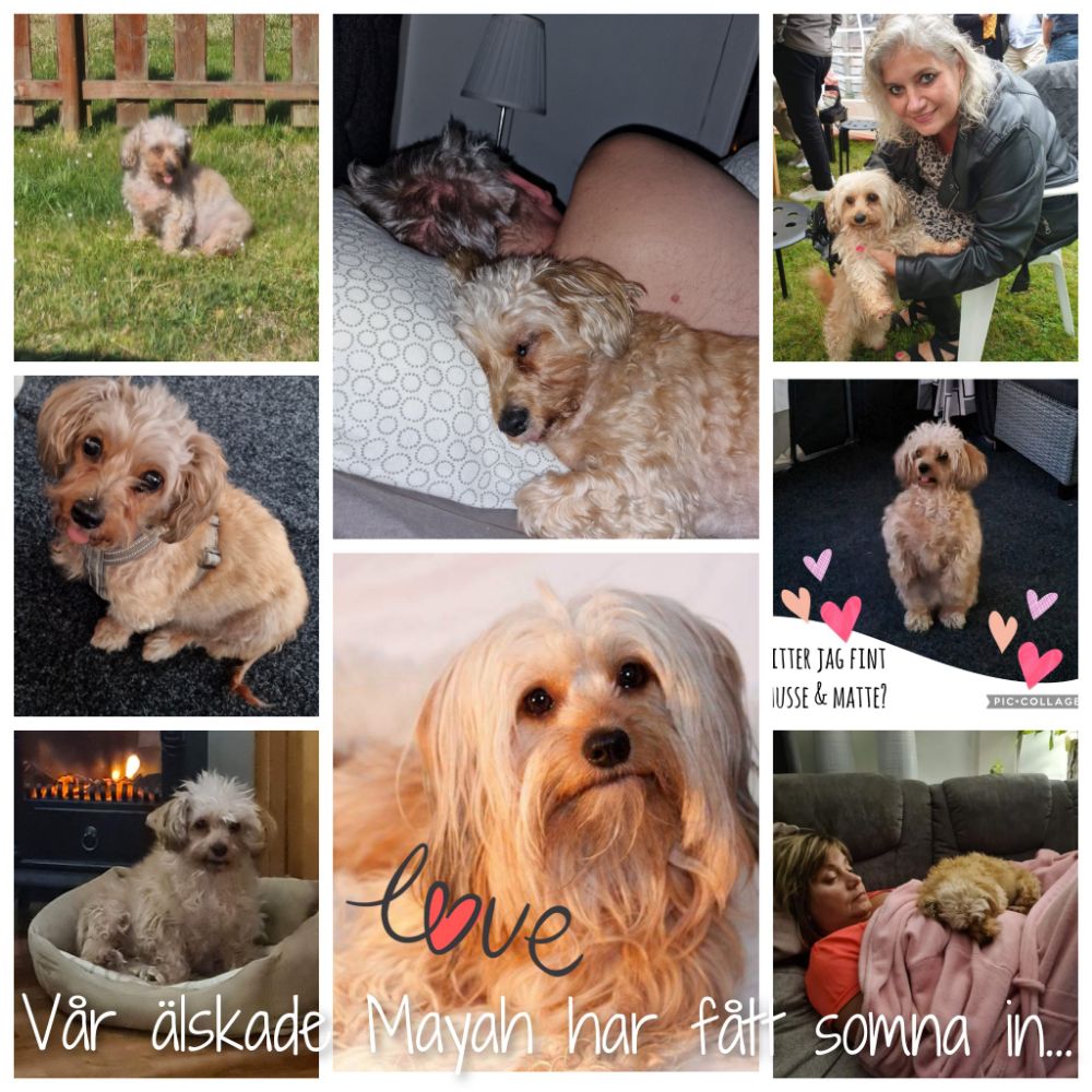 Vi minns med glädje lilla Mayah, det var mycket bus som liten valp men med tiden blev hon en kär vän till både familjen och våra vänner. Hon var en glädjespridare in i det sista. Det visade sig att hon var sjuk, livmoderinflammation och som vid besök hos veterinären den 24 juli 2023 visade mer än så. Hon hade flera juvertumörer och hjärtat var påverkat. Hon fick somna in på min arm samma förmiddag 🕯🐾🥲.