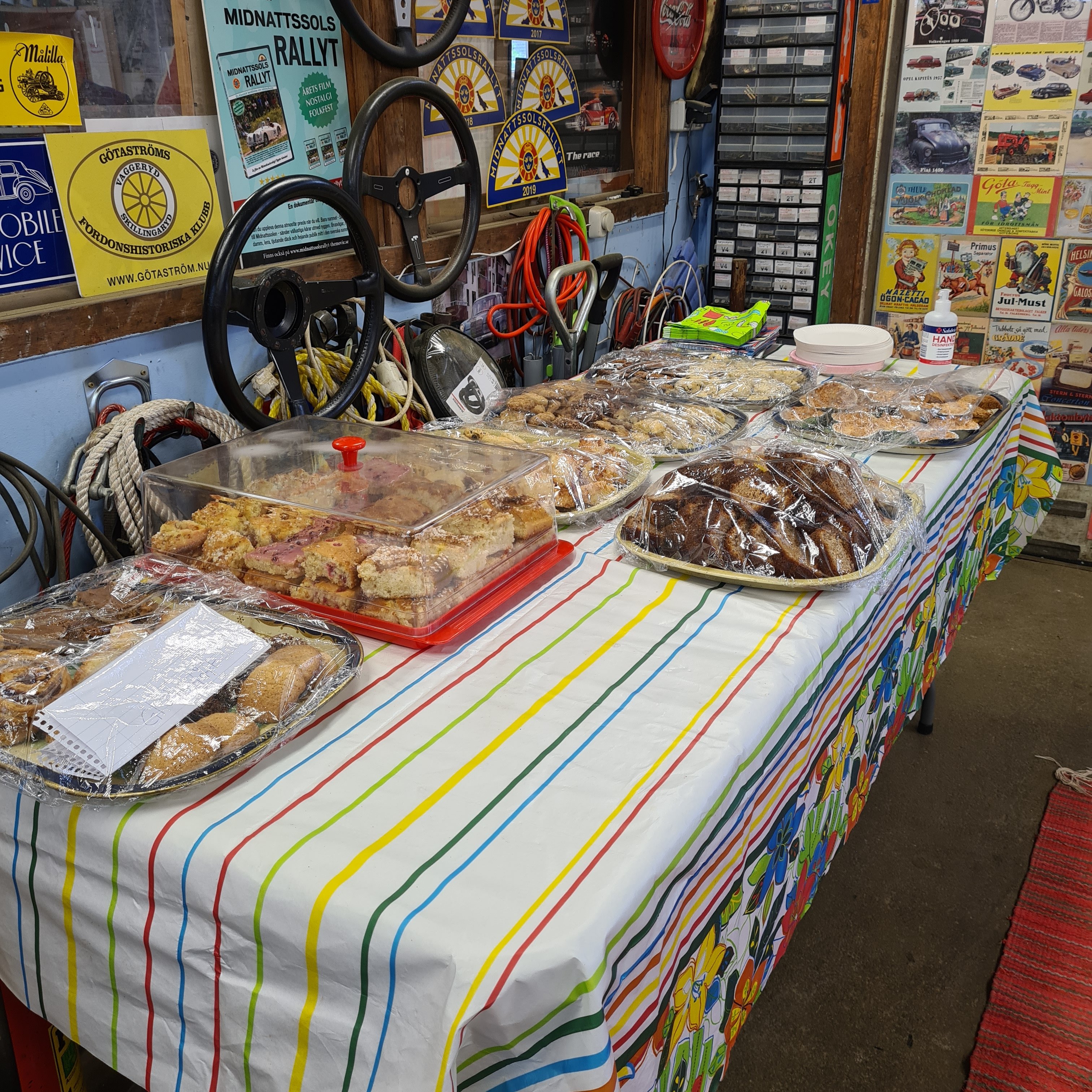 Det bjöds på korv med bröd och mos, dricka och efteråt fanns det ett helt bord fullt med olika kakor och bullar, kaffe/the till detta…du är fantastisk Sibylla!